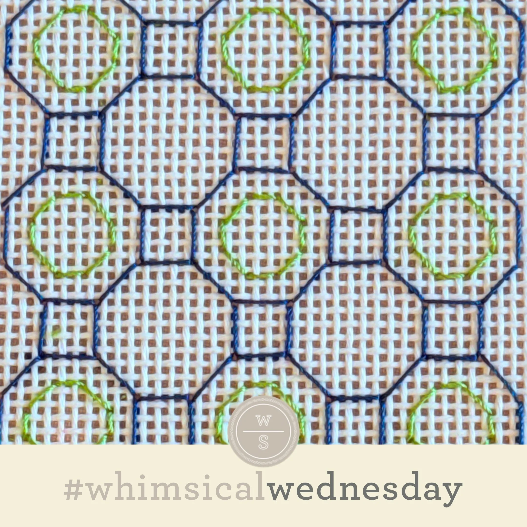 The stitched sample is blue and green Soie Perlee on 13M. Again, the plan was to fill all of the larger octagons (black lines) with the smaller octagons (yellow lines). But, as I added the small octagons, I loved the rows that emerged by leaving every other column blank. Voila!